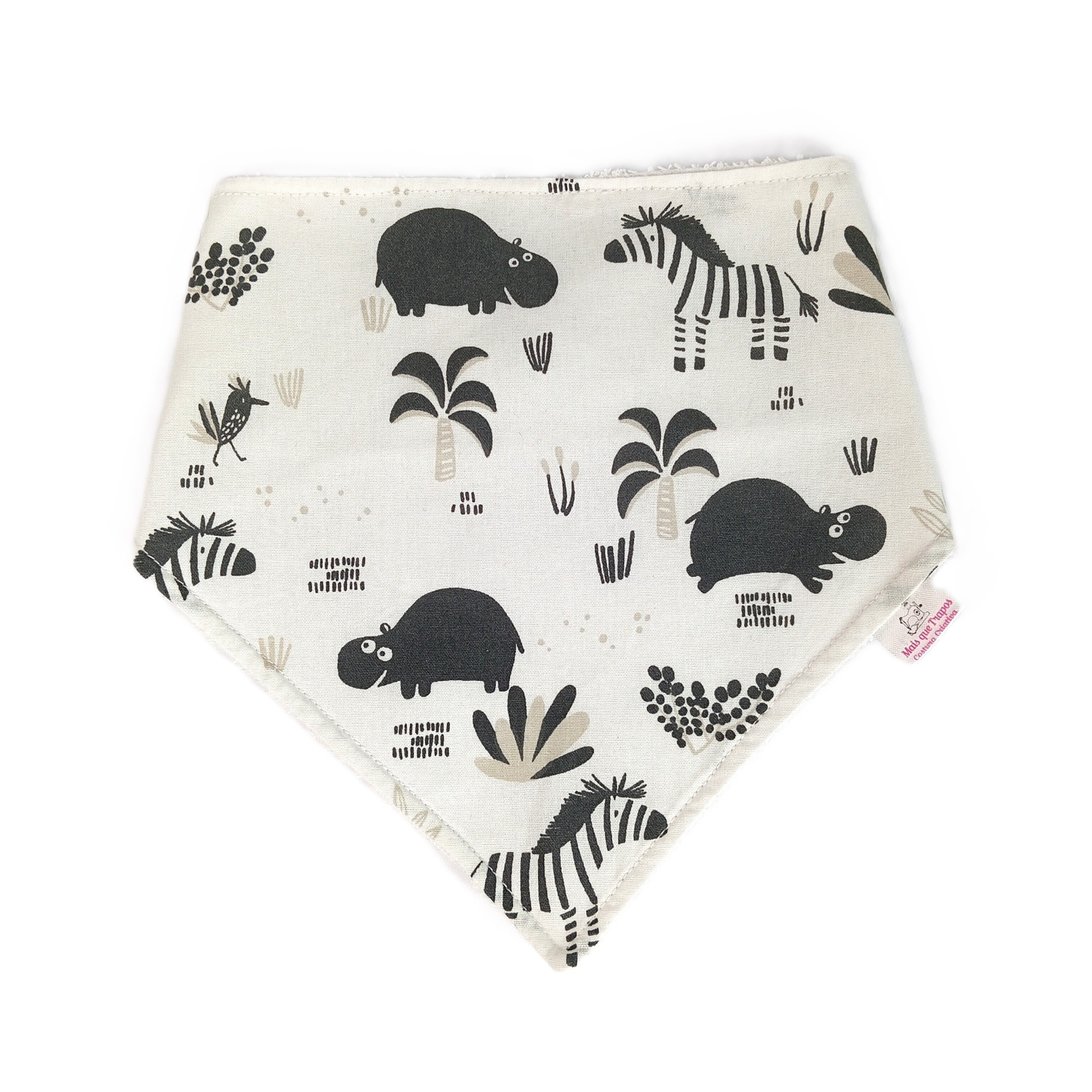 Este modelo em forma de lenço é feito em tecido de algodão na frente — macio e delicado para a pele sensível — e no verso tem turco plastificado, tornando-o totalmente impermeável e ideal para evitar que a roupa se molhe ou suje durante as refeições ou na fase da dentição.
