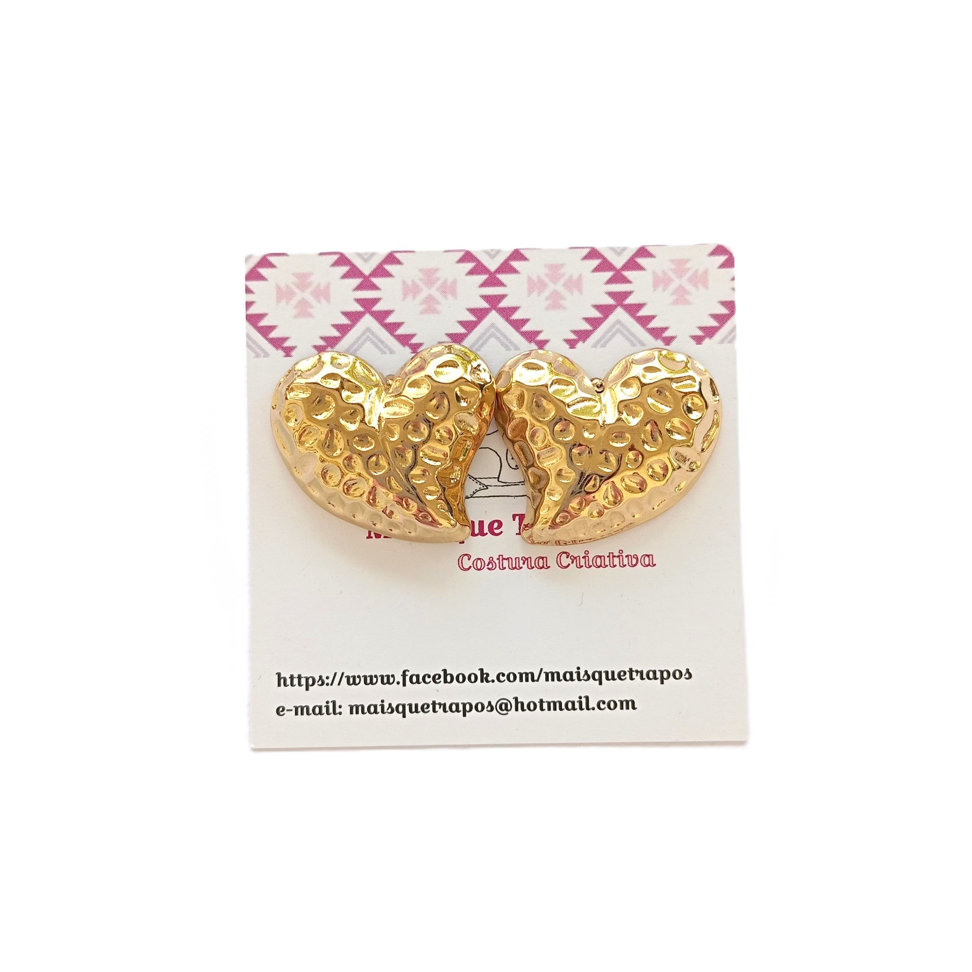 Brincos em aço inoxidável, com o formato de coração e acabamento dourado.