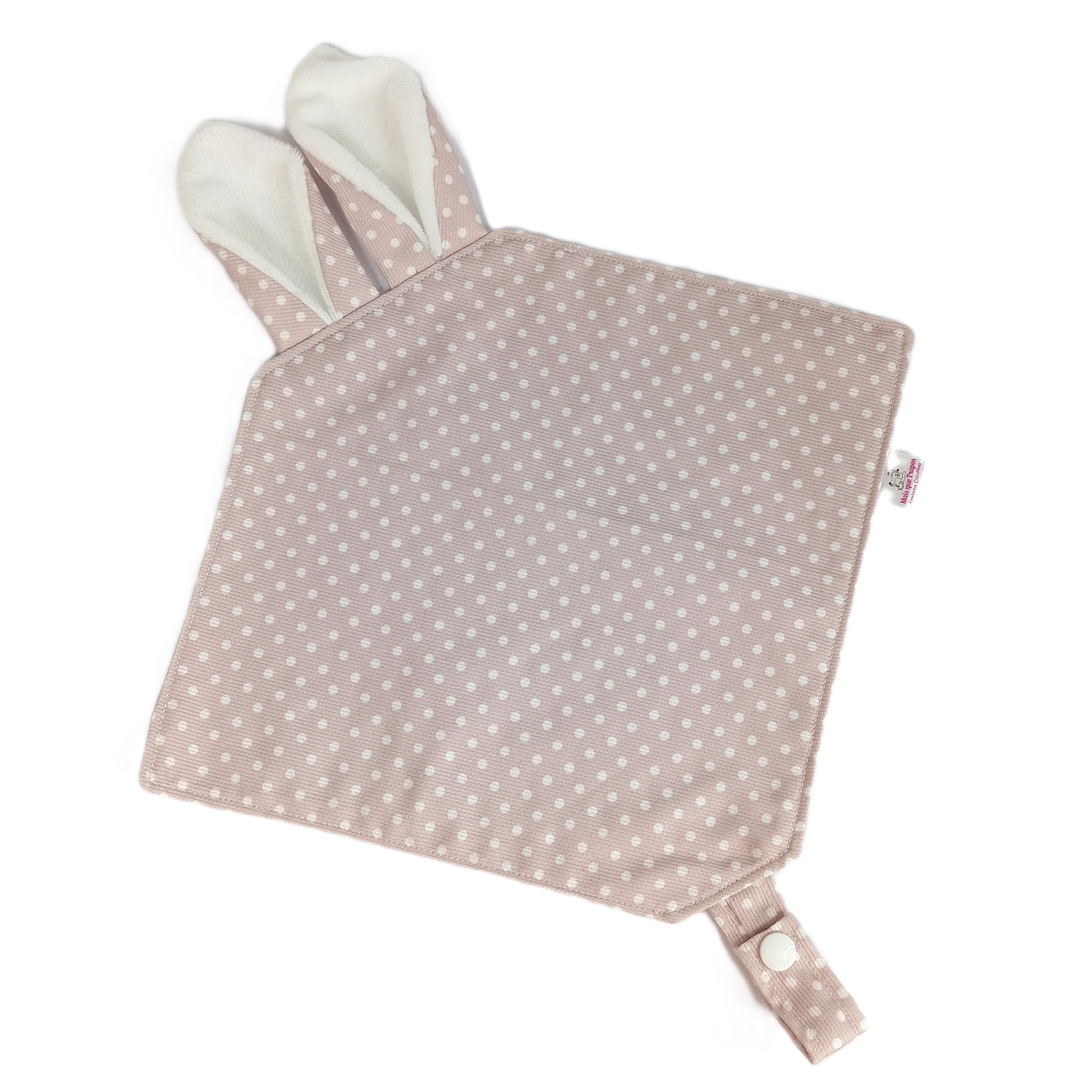 Um doudou macio com orelhinhas, perfeito para aconchegar o bebé, e com prende-chuchas integrado para nunca perder a chupeta.