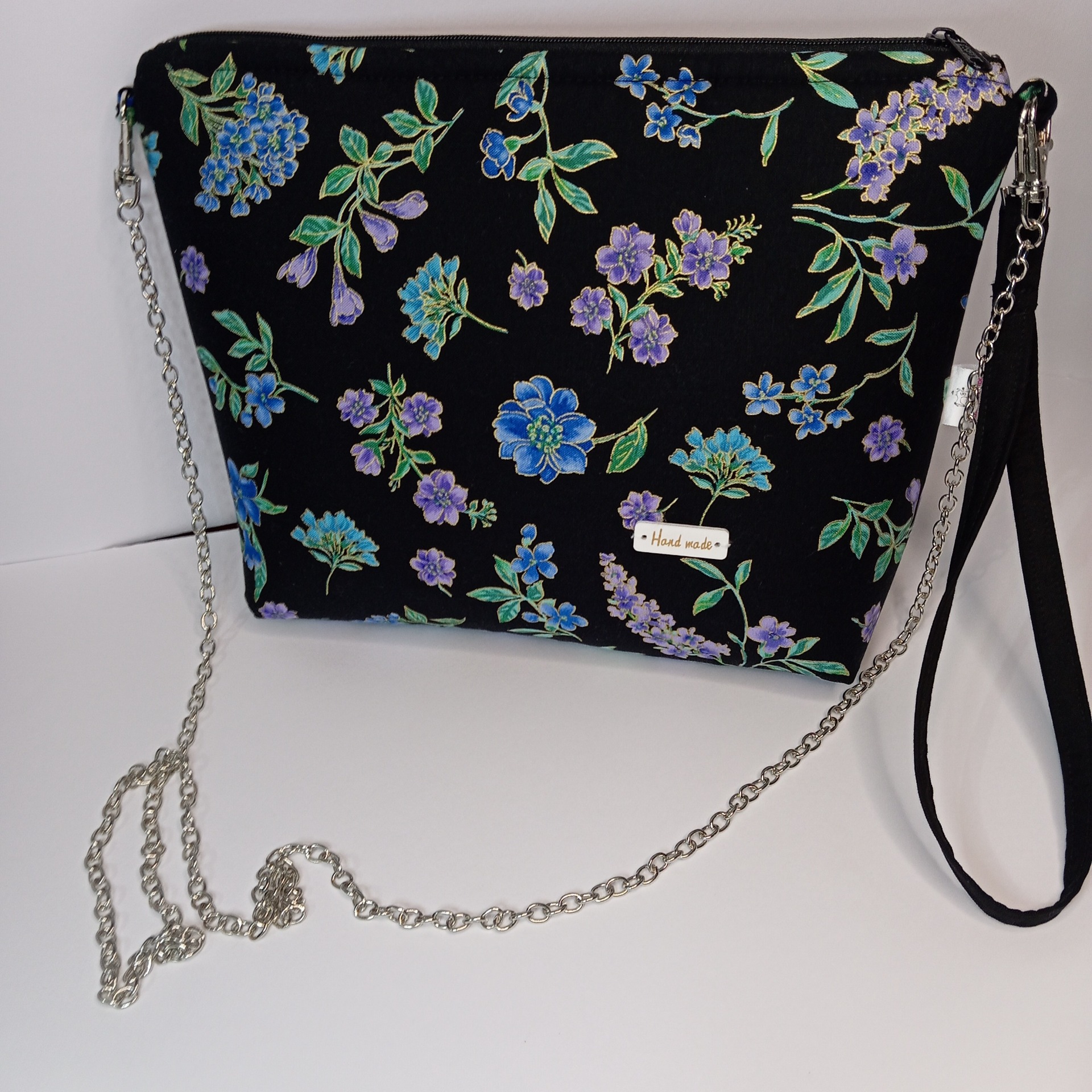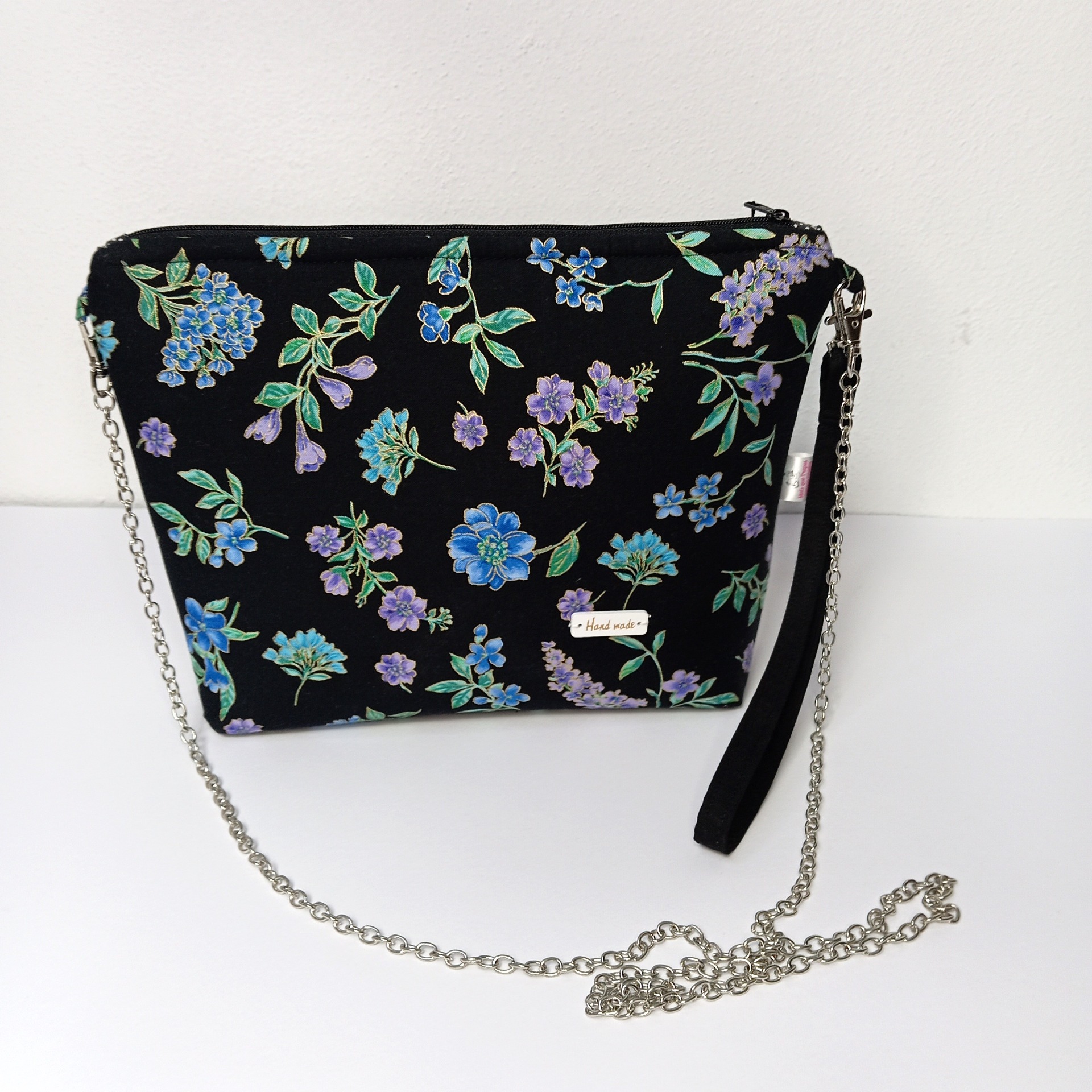 Esta necessaire versátil em tecido pode ser usada á tiracolo, com pega de mão ou simplesmente dentro de uma mala.