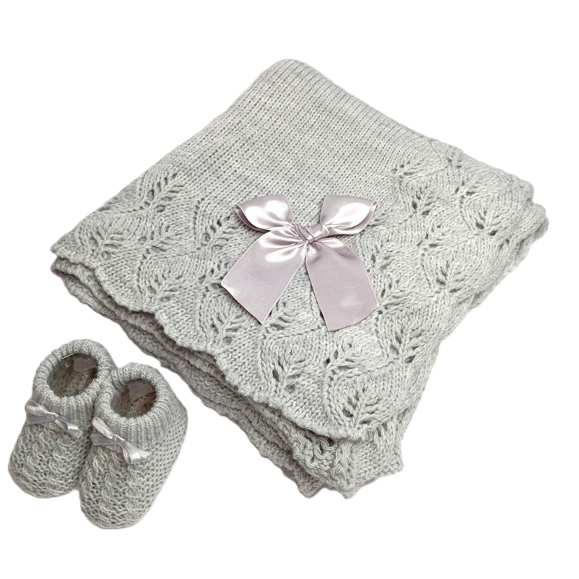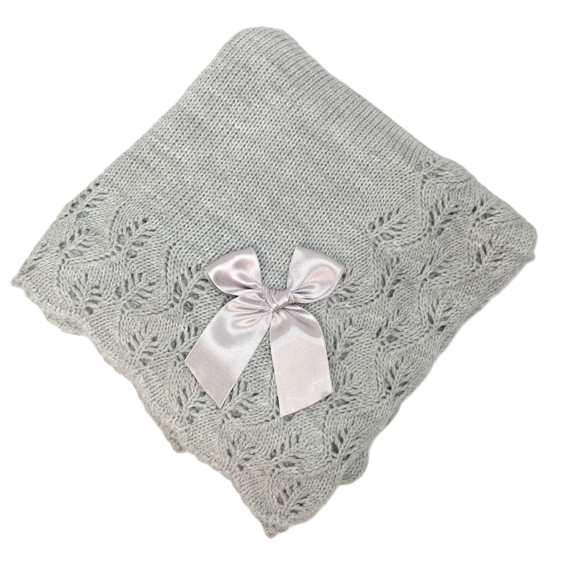 Manta de malha macia, com laço decorativo, ideal para aquecer o bebé com estilo e carinho.