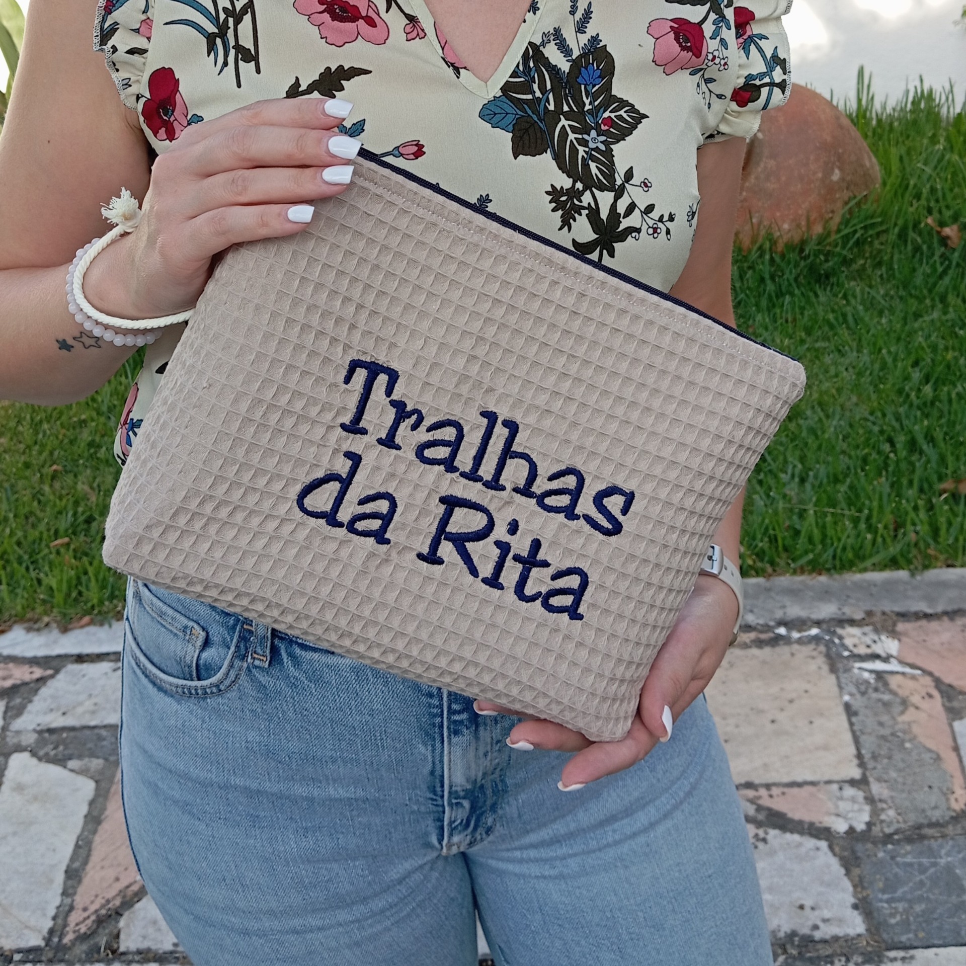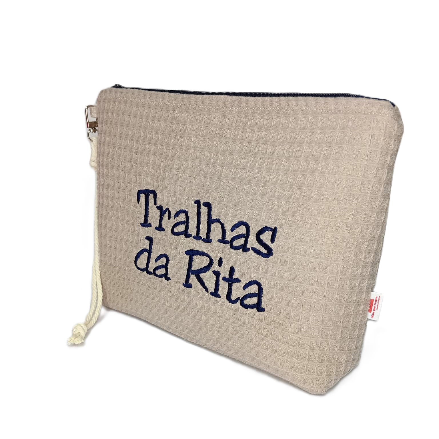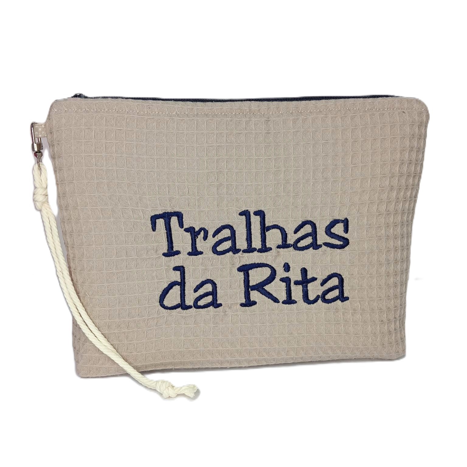 Necessaire artesanal com a frase “Tralhas da Rita” bordada à máquina. Um presente original e cheio de significado.